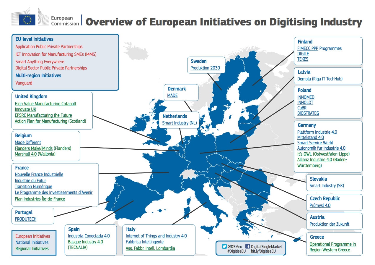 France’s Industrie du futur has been conceived in close cooperation between French and German industry associations, acccompanied by both governments and the European commission, and became a model for Italy’s strategy „Fabbrica Intelligente“, Spains „Industria Conectada 4.0“ and, more general, an EU-wide incentive for industrial digitization.