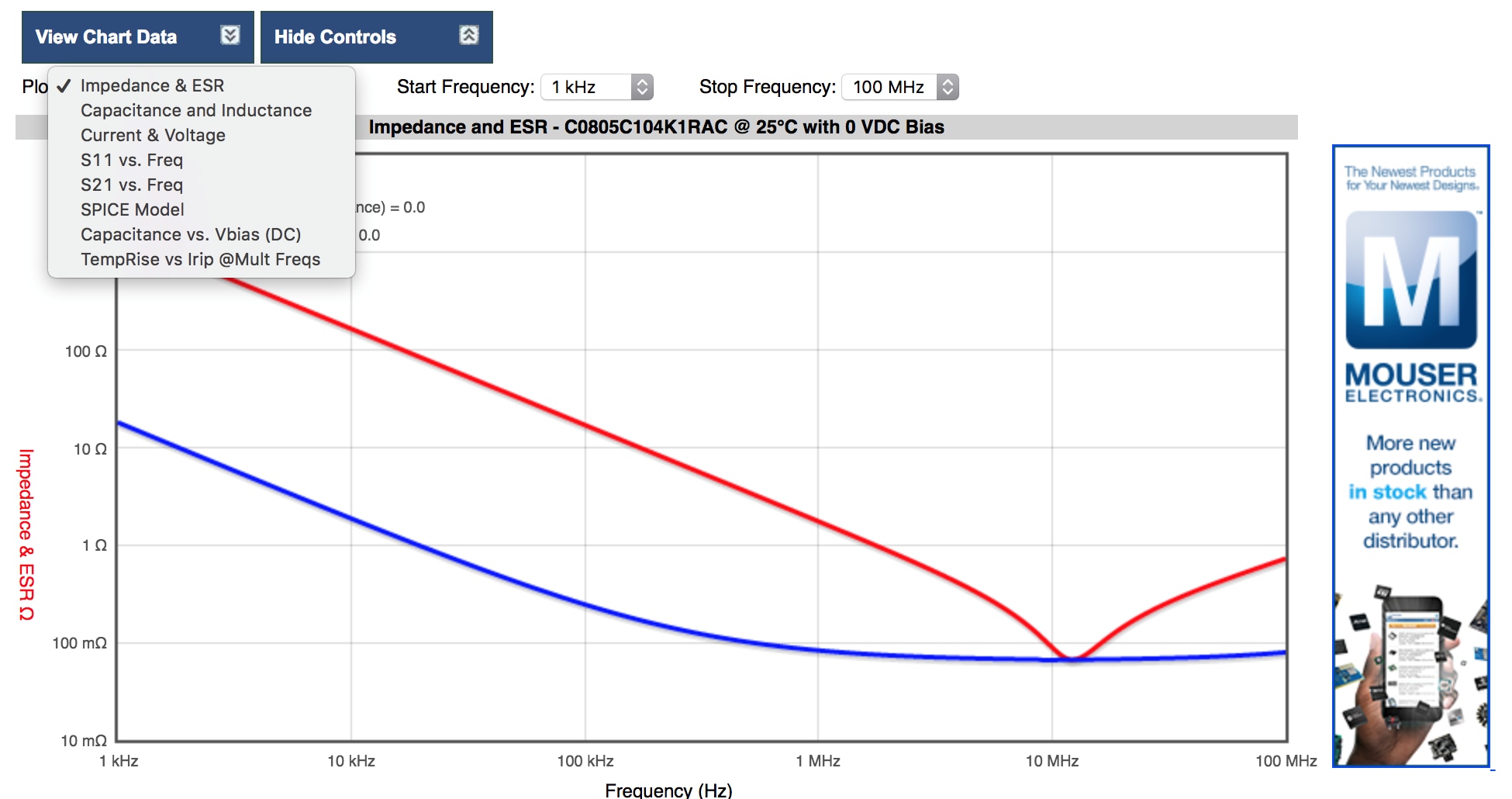 K-SIM can provide plots on ESR/impedance vs. frequency; capacitance change vs. frequency, ripple current calculations, S-parameters, and netlists; and for ceramics, a capacitance change vs. applied voltage (Figure 5).