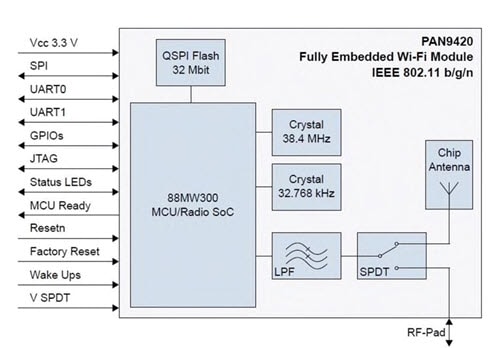 The Panasonic PAN9420 Embedded Wi-Fi Module supports the 802.11 b/g/n Wi-Fi standard at 2.4GHz. It has an onboard central processing unit (CPU) to run a full network IP stack along with a Web server, internal static-random-access memory (SRAM), and in-system programmable flash memory (Figure 1). The module supports both access-point and infrastructure modes concurrently, to make it easy to set-up simultaneous Wi-Fi connections to smart devices and home network routers. The firmware also supports client, micro-access-point, and ad-hoc mode applications. It can also receive updates over-the-air, a vitally important feature for IoT devices.