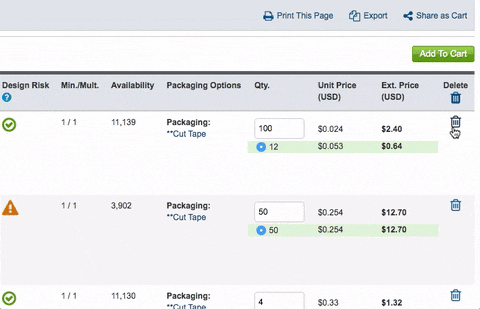 Select the trash can icon on the BOM line you wish to delete. Confirm your selection or cancel. The page will reload and update your BOM accordingly.
