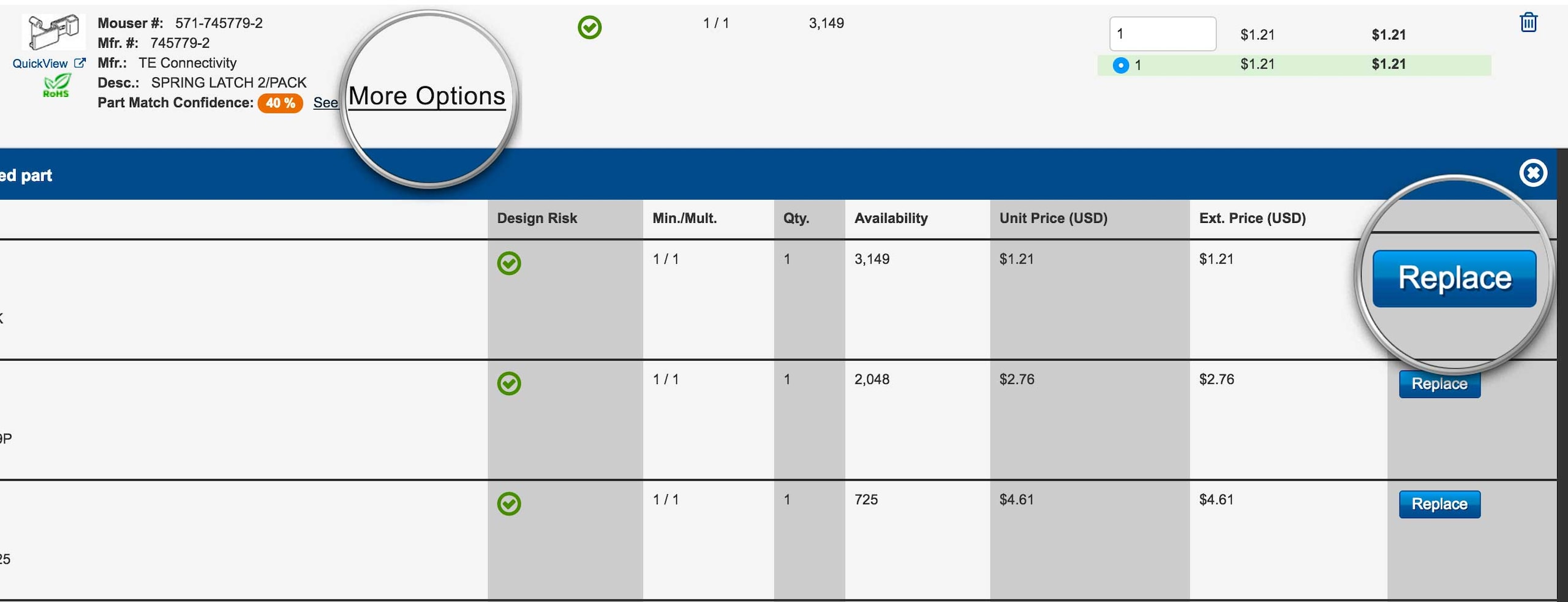 Simply select "Replace" on one of the product options to change your BOM line.
