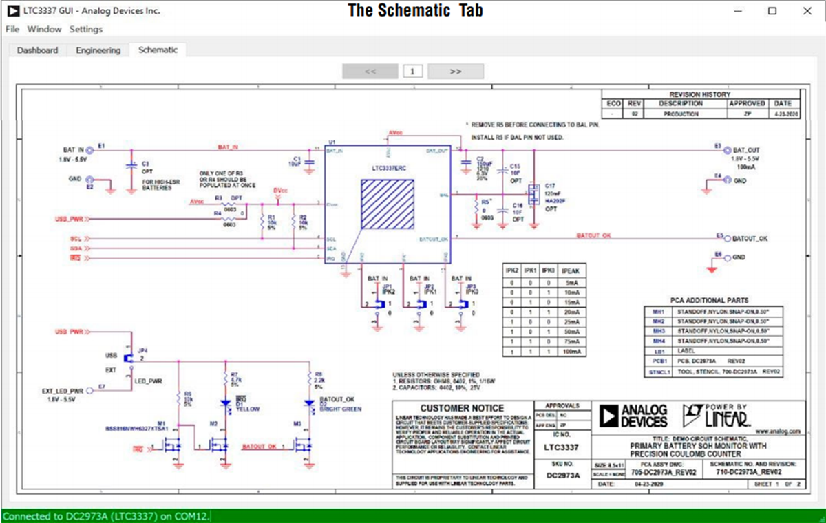 Analog Devices Inc. DC2973A Demonstration Board is an evaluation platform for the LTC3337 Primary Battery State of Health (SOH) Monitor. The LTC3337 features an integrated infinite dynamic range coulomb counter and a configurable peak current limit. The LTC3337 supports input voltages from 1.8V to 5.5V and a peak current up to 100mA with a quiescent current of 100nA. The device measures coulomb count, voltage, temperature, and Battery Series Resistance (BSR) to quantify the charge state and health of a battery.The Analog Devices Inc. DC2973A demonstrates a simple layout for the highest-power configuration of the LTC3337. The circuit can be reduced for lower IPEAK levels. The Demonstration Board can be connected directly to a PC using a micro USB cable to run a GUI and configure a simple Battery State of Charge (SOC) monitor. Source code for the GUI is available and can be used as a starting point for LTC3337 firmware development.